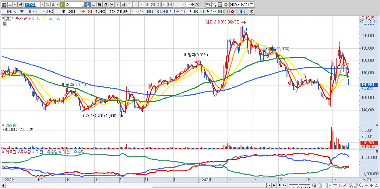 - SK (160,500원 ▼ -3.95% , 시총: 116,367억, 거래량: 910,380, 거래대금:1,452억)