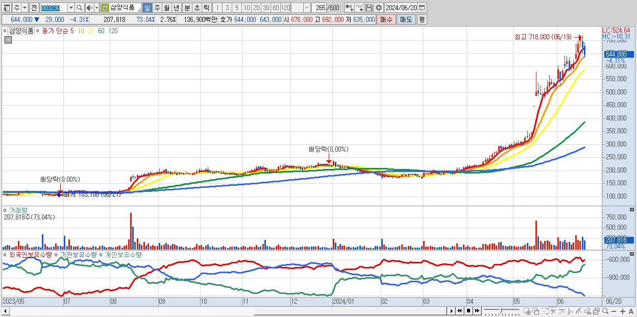- 삼양식품 (644,000원 ▼ -4.31% , 시총: 48,513억, 거래량: 207,818, 거래대금:1,369억)