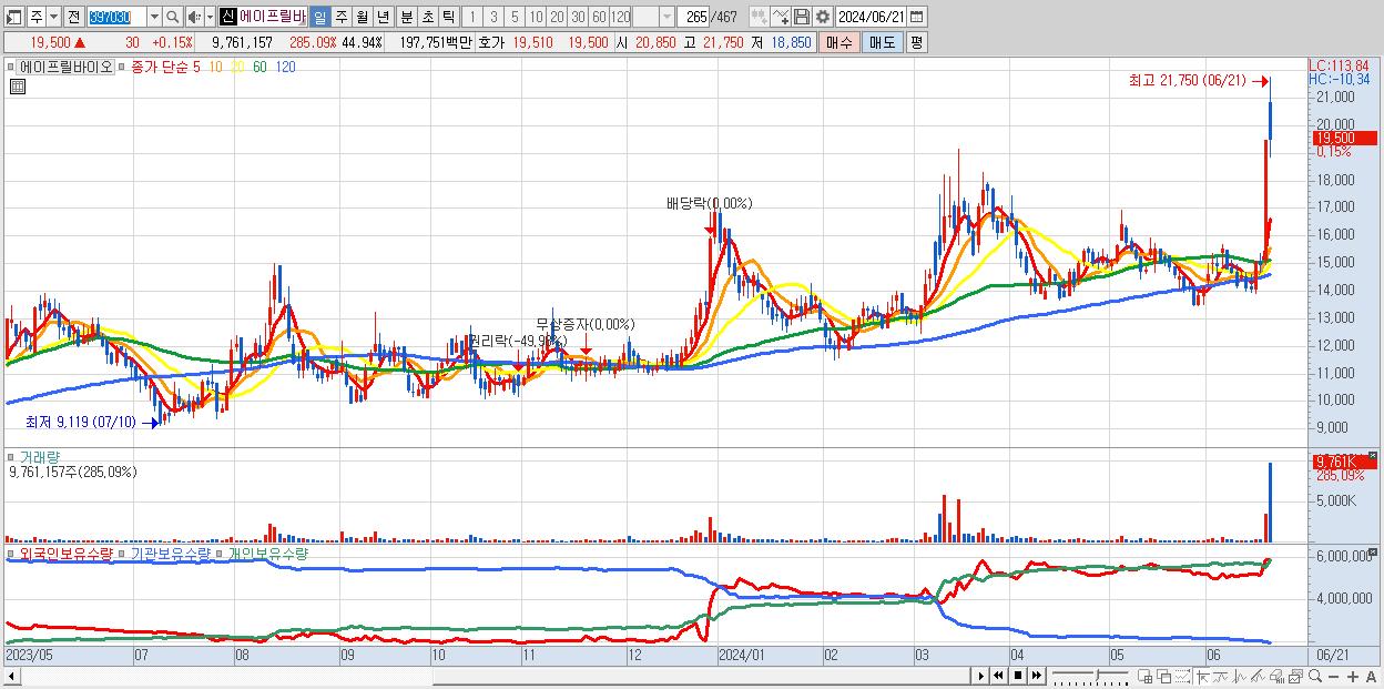 - 에이프릴바이오 (19,500원 ▲ 0.15% , 시총: 4,236억, 거래량: 9,761,157, 거래대금:1,978억, KOSDAQ)