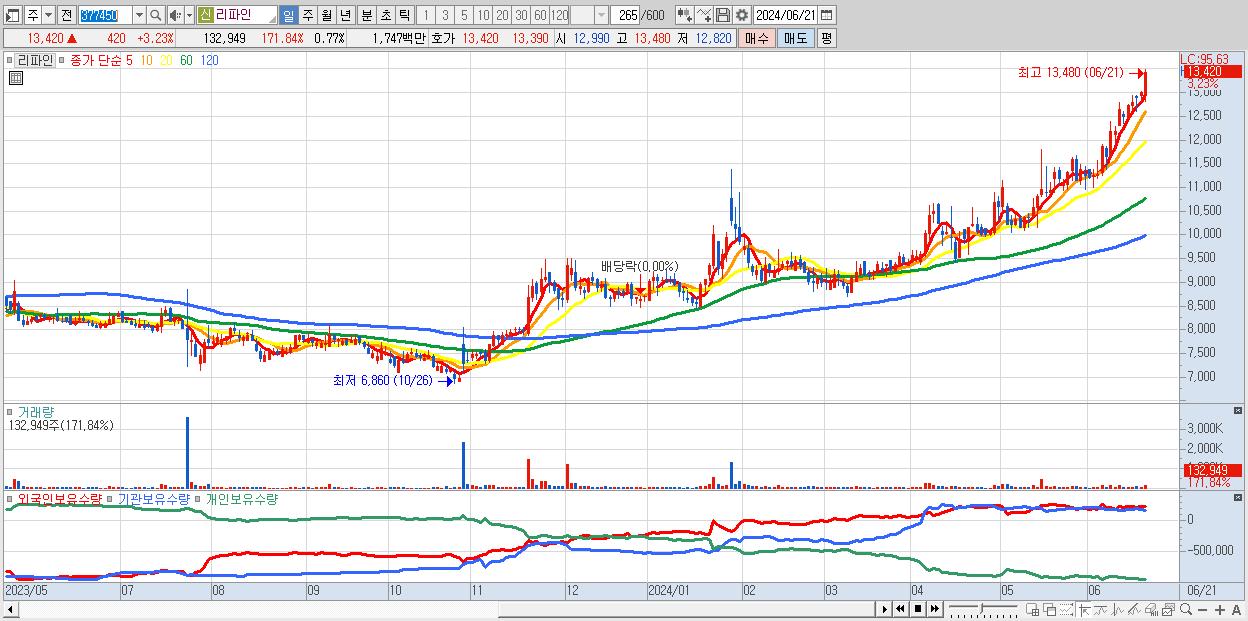 - 리파인 (13,420원 ▲ 3.23% , 시총: 2,326억, 거래량: 132,949, 거래대금:17억, KOSDAQ)