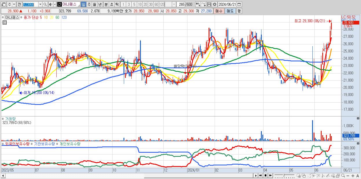 - 아나패스 (28,900원 ▲ 3.96% , 시총: 3,504억, 거래량: 323,799, 거래대금:92억, KOSDAQ)