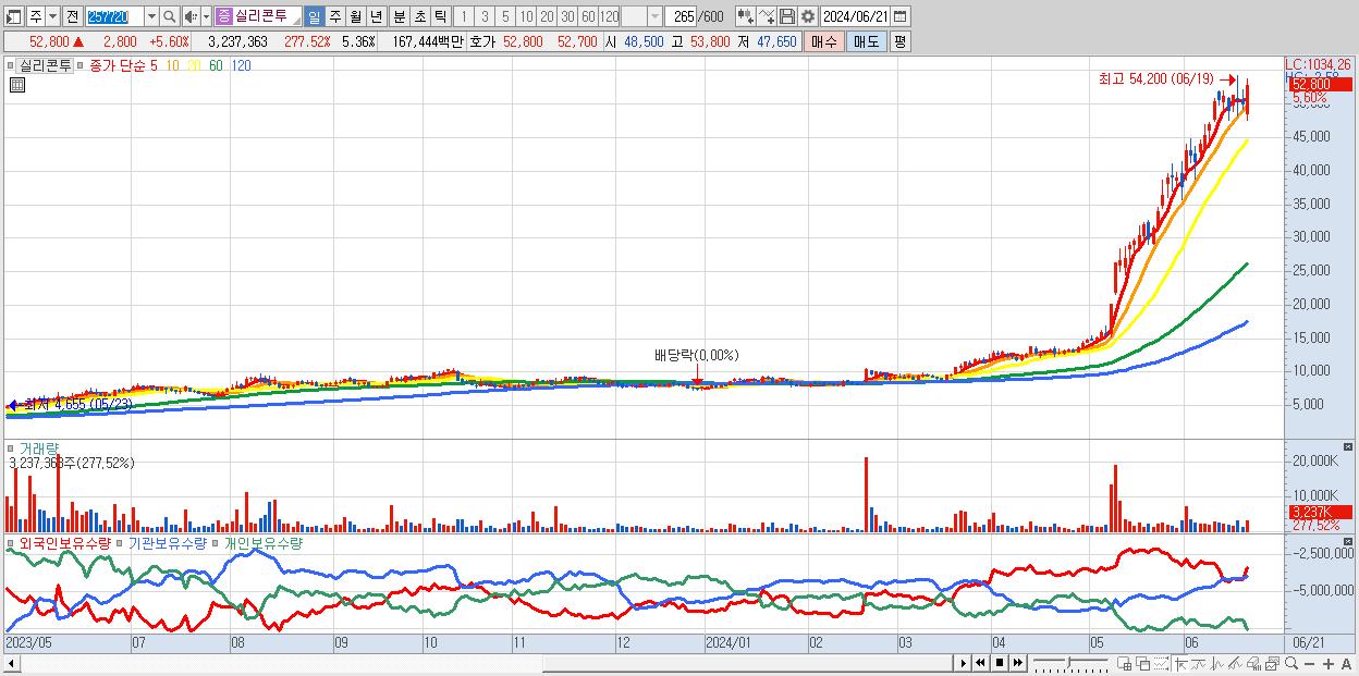 - 실리콘투 (52,800원 ▲ 5.6% , 시총: 31,886억, 거래량: 3,237,363, 거래대금:1,674억)