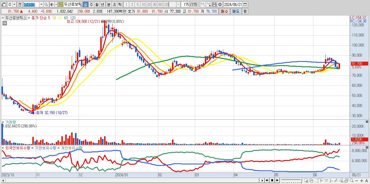 - 두산로보틱스 (81,700원 ▲ 5.69% , 시총: 52,958억, 거래량: 1,832,642, 거래대금:1,474억)