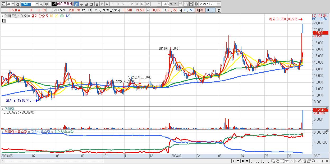- 에이프릴바이오 (19,500원 ▲ 0.15% , 시총: 4,236억, 거래량: 10,233,529, 거래대금:2,074억)