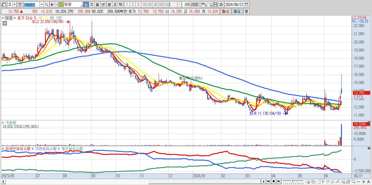 - 태광 (13,750원 ▲ 2.61% , 시총: 3,644억, 거래량: 18,024,370, 거래대금:2,695억)