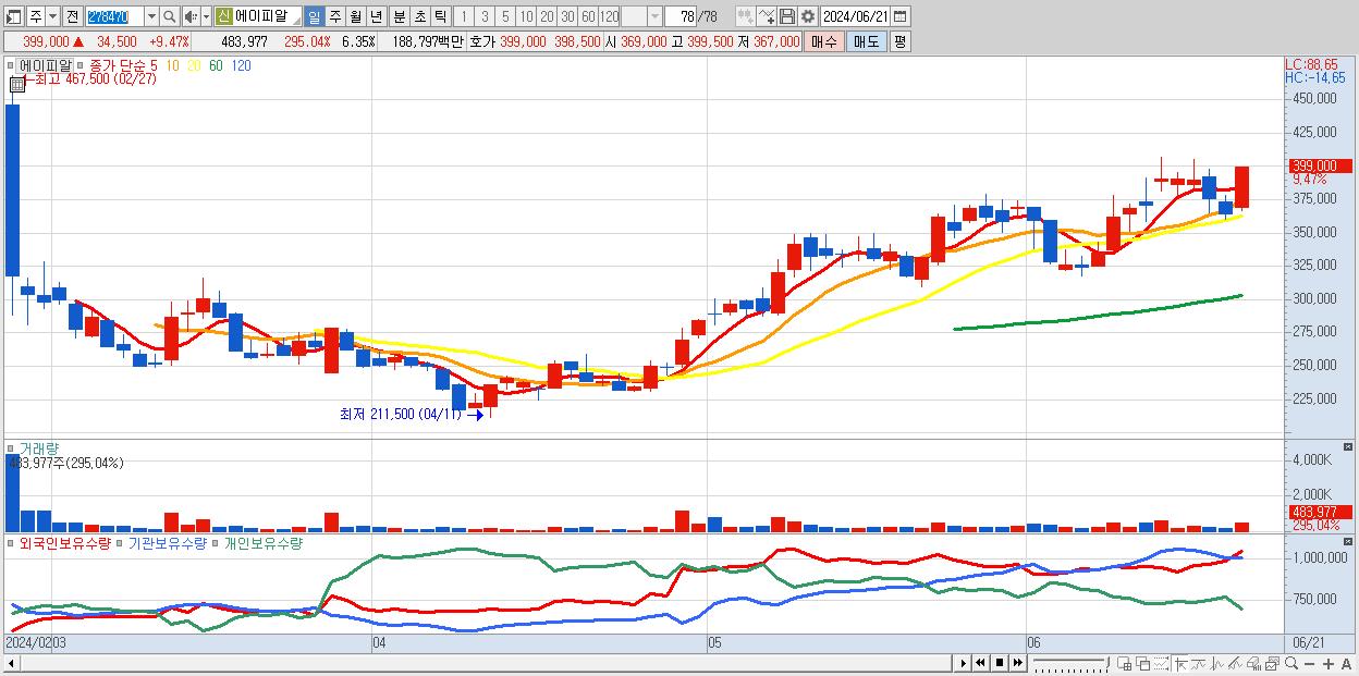 - 에이피알 (399,000원 ▲ 9.47% , 시총: 30,405억, 거래량: 483,977, 거래대금:1,888억)