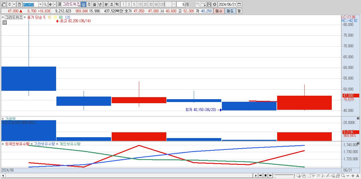 - 그리드위즈 (47,000원 ▲ 16.63% , 시총: 3,733억, 거래량: 9,212,623, 거래대금:4,375억)