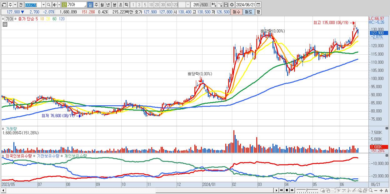- 기아 (127,900원 ▼ -2.07% , 시총: 511,419억, 거래량: 1,680,099, 거래대금:2,152억)