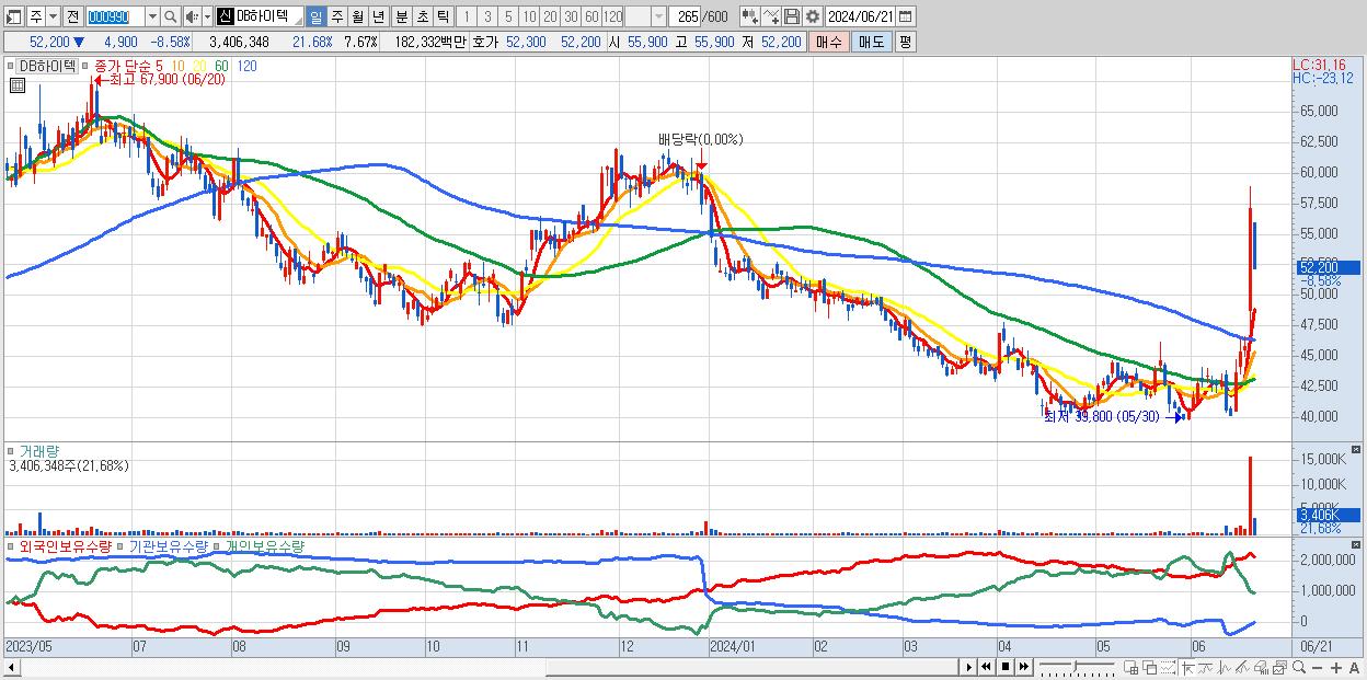 - DB하이텍 (52,200원 ▼ -8.58% , 시총: 23,176억, 거래량: 3,406,348, 거래대금:1,823억)