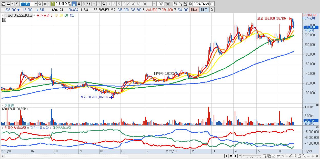- 한화에어로스페이스 (236,000원 ▼ -4.84% , 시총: 119,487억, 거래량: 680,174, 거래대금:1,623억)