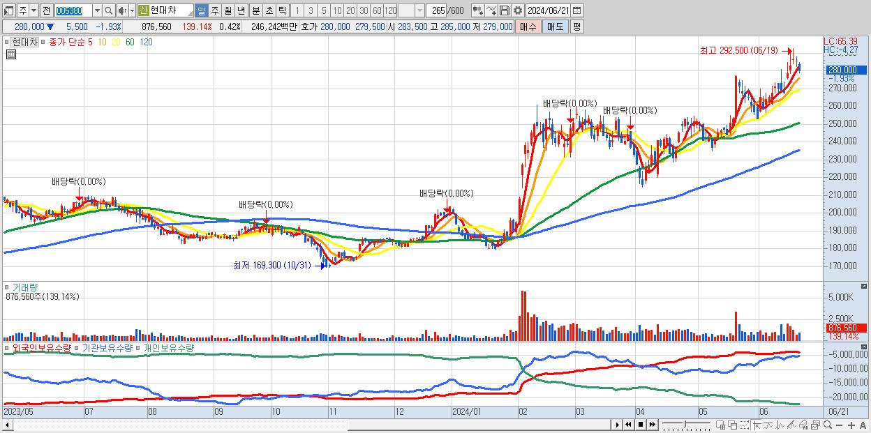 - 현대차 (280,000원 ▼ -1.93% , 시총: 586,365억, 거래량: 876,560, 거래대금:2,462억)