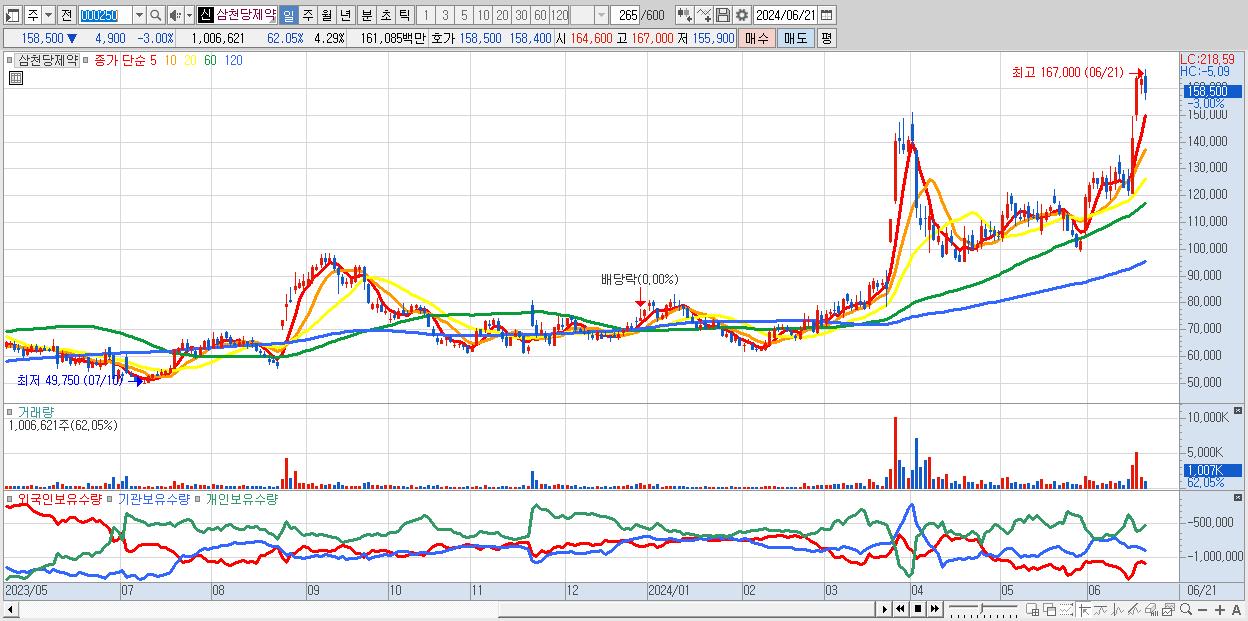- 삼천당제약 (158,500원 ▼ -3% , 시총: 37,180억, 거래량: 1,006,621, 거래대금:1,611억)