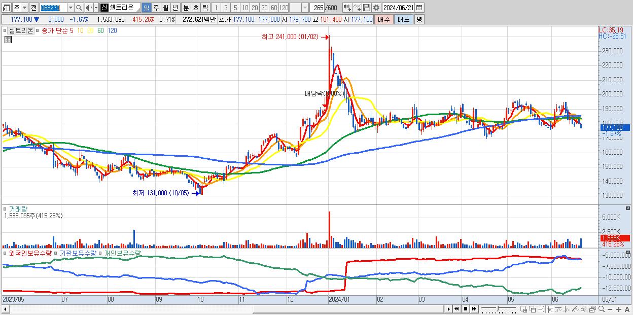 - 셀트리온 (177,100원 ▼ -1.67% , 시총: 384,295억, 거래량: 1,533,095, 거래대금:2,726억)