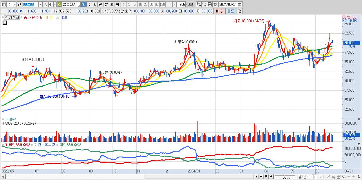 - 삼성전자 (80,000원 ▼ -1.96% , 시총: 4,775,826억, 거래량: 17,907,523, 거래대금:14,374억)