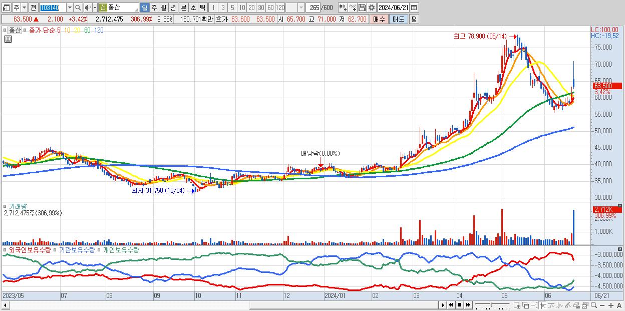 - 풍산 (63,500원 ▲ 3.42% , 시총: 17,795억, 거래량: 2,712,475, 거래대금:1,807억)