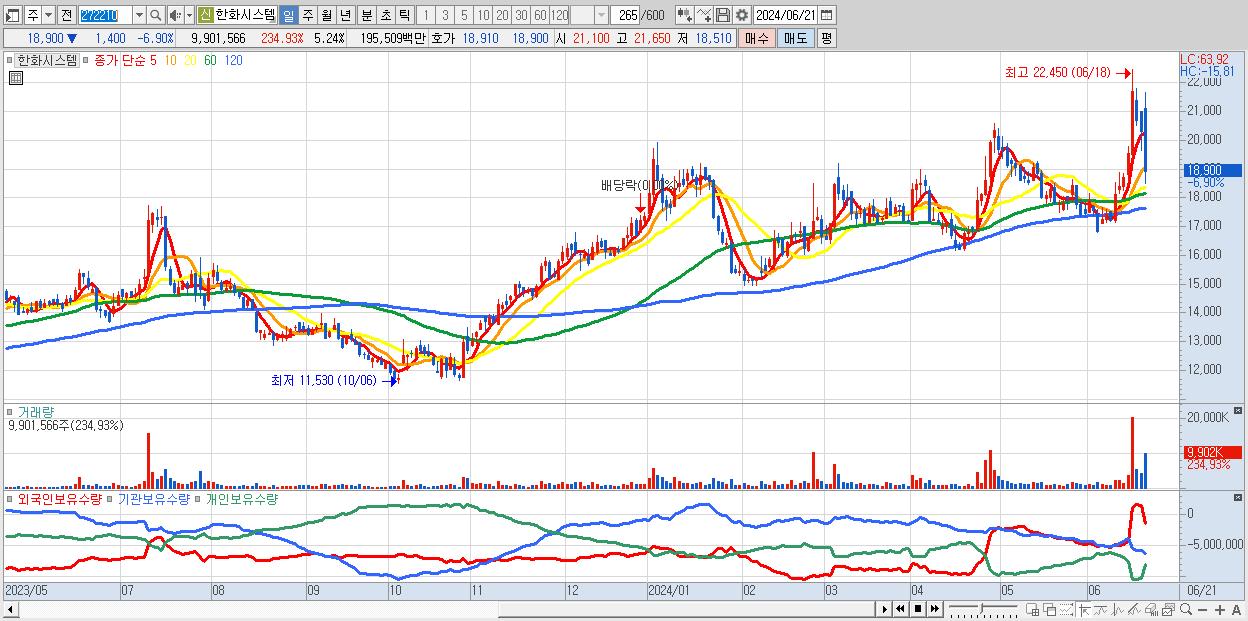 - 한화시스템 (18,900원 ▼ -6.9% , 시총: 35,706억, 거래량: 9,901,566, 거래대금:1,955억)