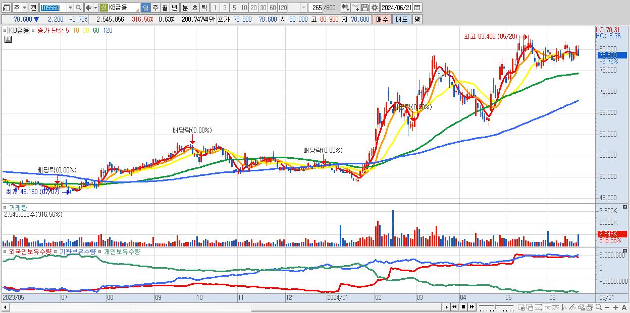 - KB금융 (78,600원 ▼ -2.72% , 시총: 317,160억, 거래량: 2,545,856, 거래대금:2,007억)