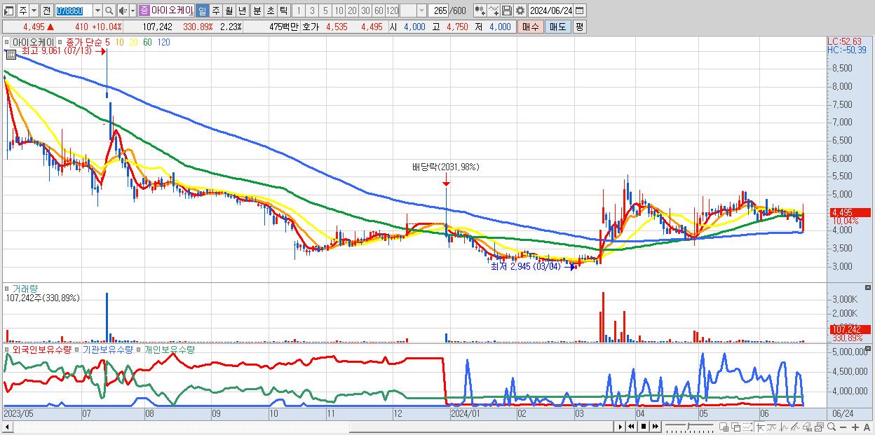 - 아이오케이 (4,495원 ▲ 10.04% , 시총: 216억, 거래량: 107,242, 거래대금:5억)