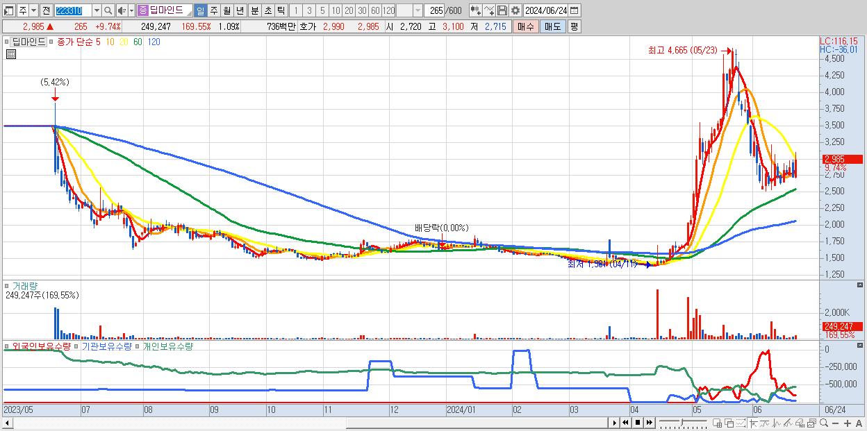 - 딥마인드 (2,985원 ▲ 9.74% , 시총: 682억, 거래량: 249,247, 거래대금:7억)