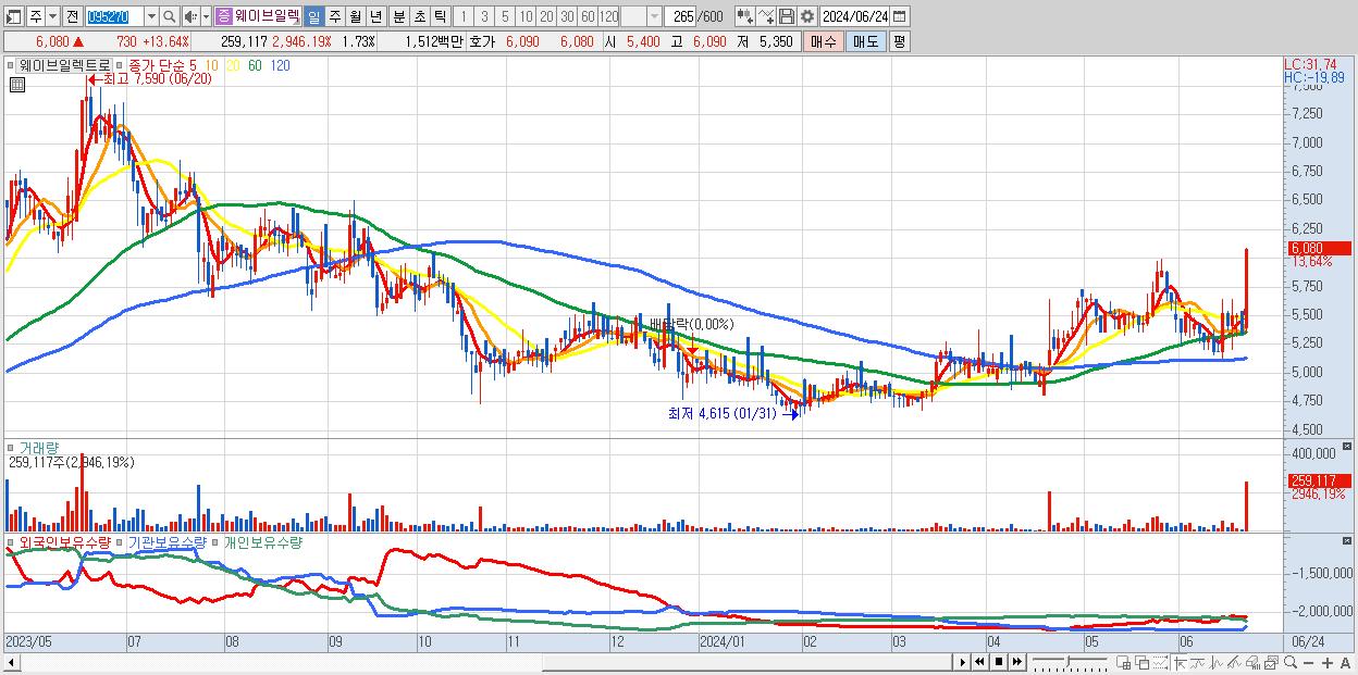 - 웨이브일렉트로 (6,080원 ▲ 13.64% , 시총: 910억, 거래량: 259,117, 거래대금:15억)