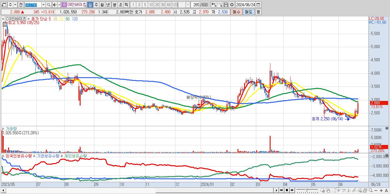 - CG인바이츠 (2,880원 ▲ 13.61% , 시총: 2,215억, 거래량: 1,026,550, 거래대금:29억)