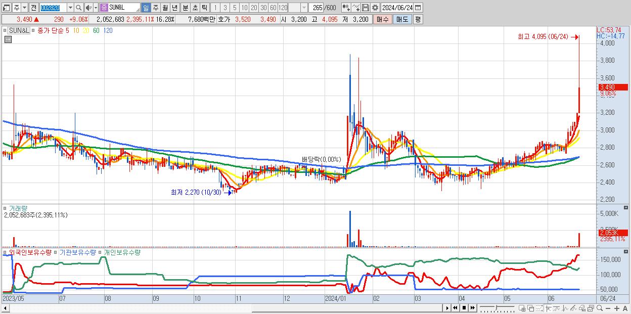 - SUN&L (3,490원 ▲ 9.06% , 시총: 440억, 거래량: 2,052,683, 거래대금:77억)