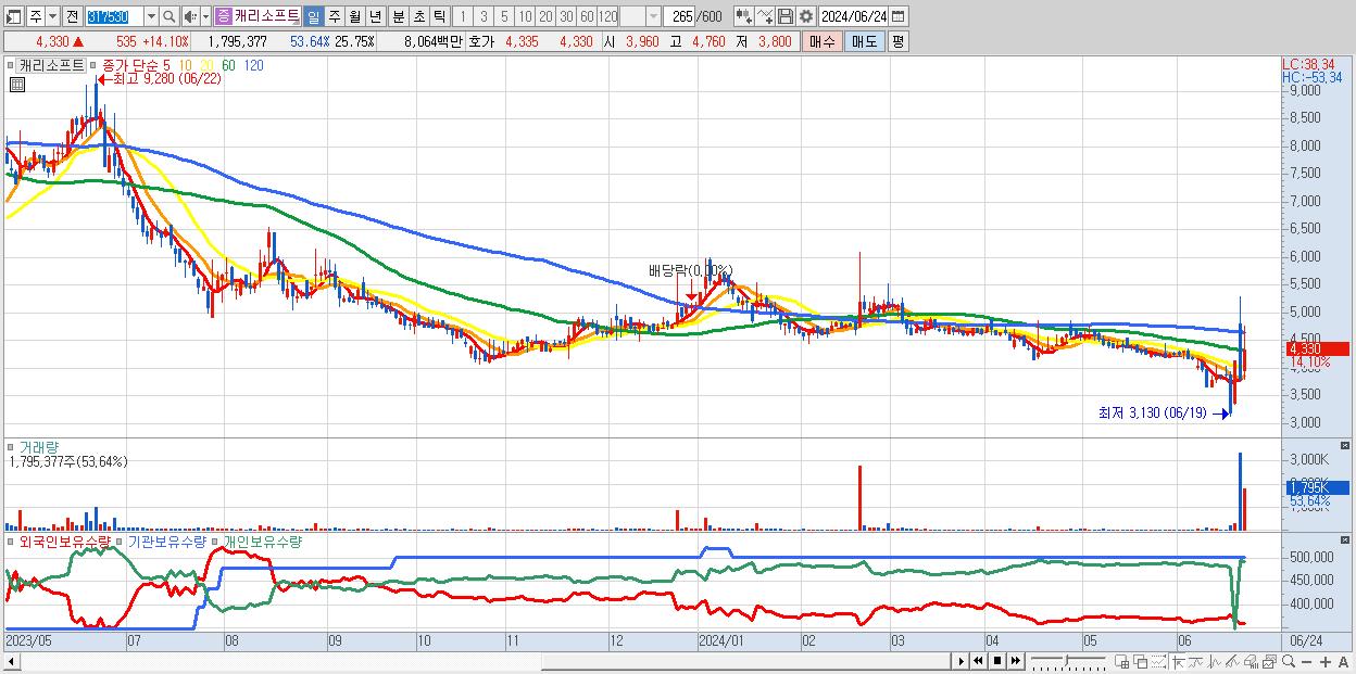 - 캐리소프트 (4,330원 ▲ 14.1% , 시총: 302억, 거래량: 1,795,377, 거래대금:81억)