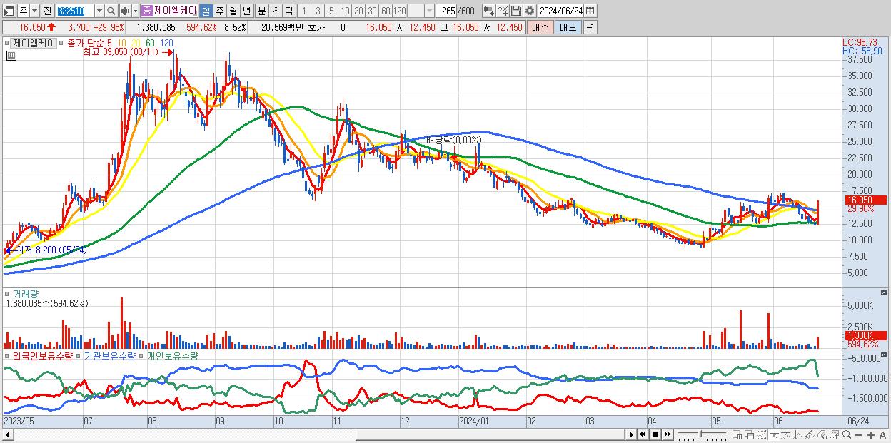 - 제이엘케이 (16,050원 ▲ 29.96% , 시총: 2,599억, 거래량: 1,380,085, 거래대금:206억)