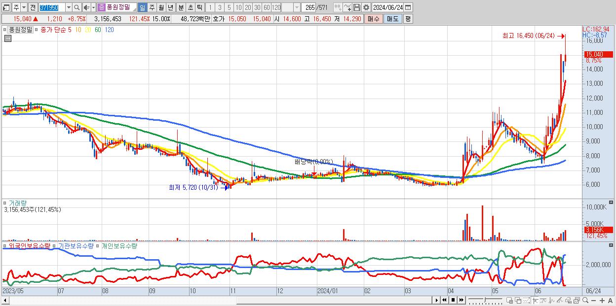 - 풍원정밀 (15,040원 ▲ 8.75% , 시총: 3,164억, 거래량: 3,156,453, 거래대금:487억)