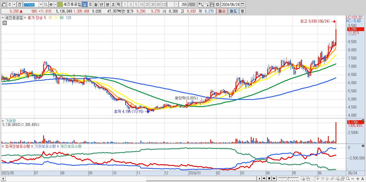 - 세진중공업 (9,280원 ▲ 11.81% , 시총: 5,276억, 거래량: 5,136,049, 거래대금:474억)