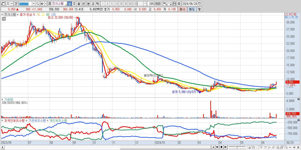 - 진시스템 (9,050원 ▲ 11.04% , 시총: 632억, 거래량: 936,593, 거래대금:84억)