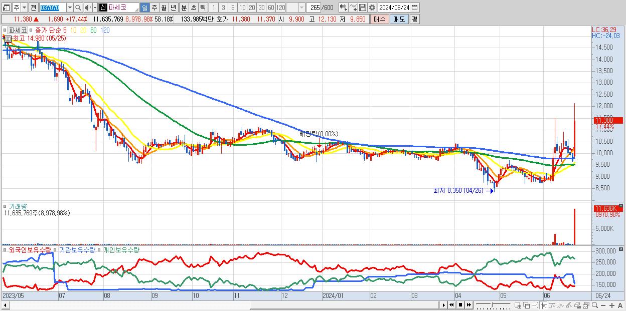 - 파세코 (11,380원 ▲ 17.44% , 시총: 2,276억, 거래량: 11,635,769, 거래대금:1,340억)