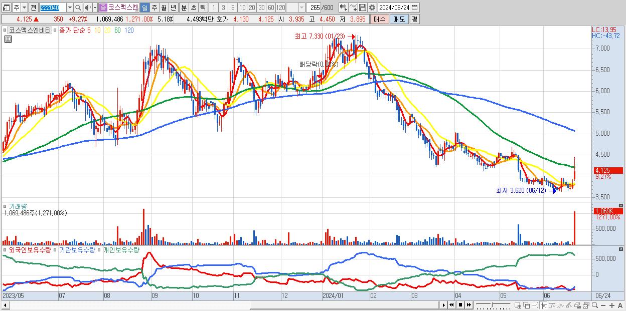 - 코스맥스엔비티 (4,125원 ▲ 9.27% , 시총: 851억, 거래량: 1,069,486, 거래대금:45억)