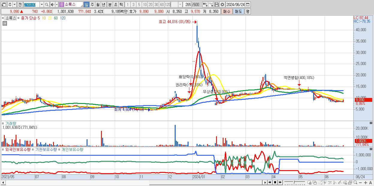 - 소룩스 (9,090원 ▲ 8.86% , 시총: 2,663억, 거래량: 1,001,638, 거래대금:92억)