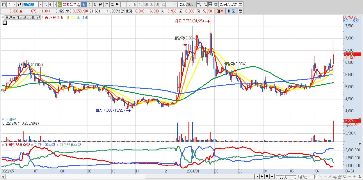 - 브랜드엑스코퍼레이션 (6,330원 ▲ 11.84% , 시총: 1,853억, 거래량: 6,322,946, 거래대금:414억)