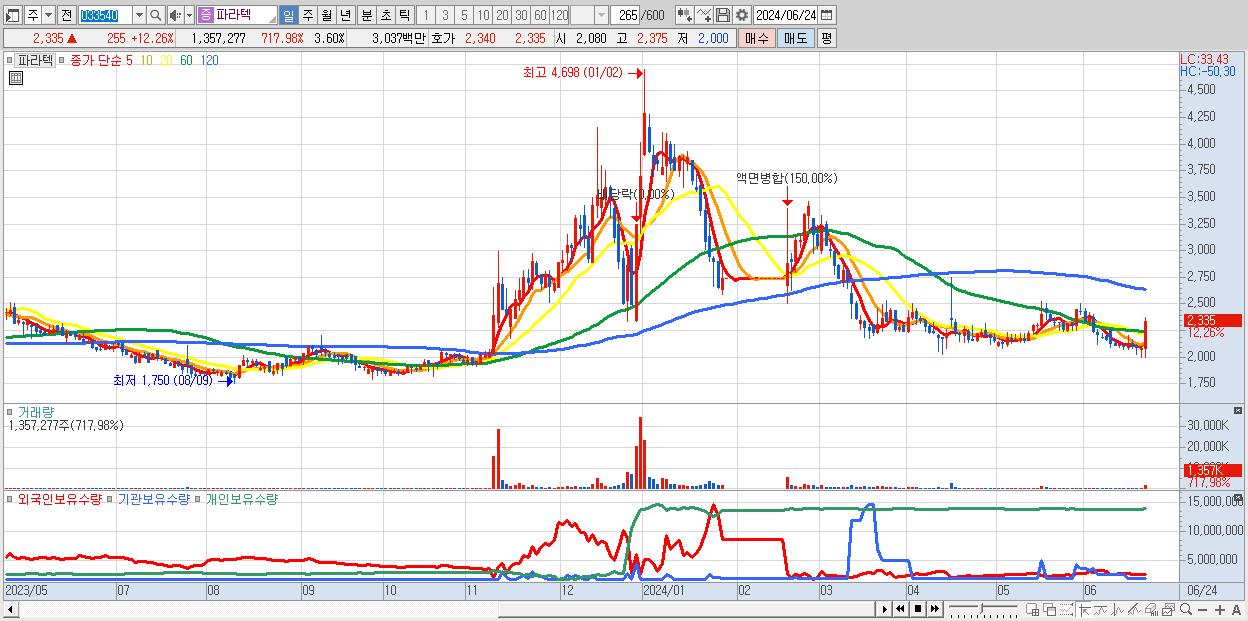 - 파라텍 (2,335원 ▲ 12.26% , 시총: 881억, 거래량: 1,357,277, 거래대금:30억)