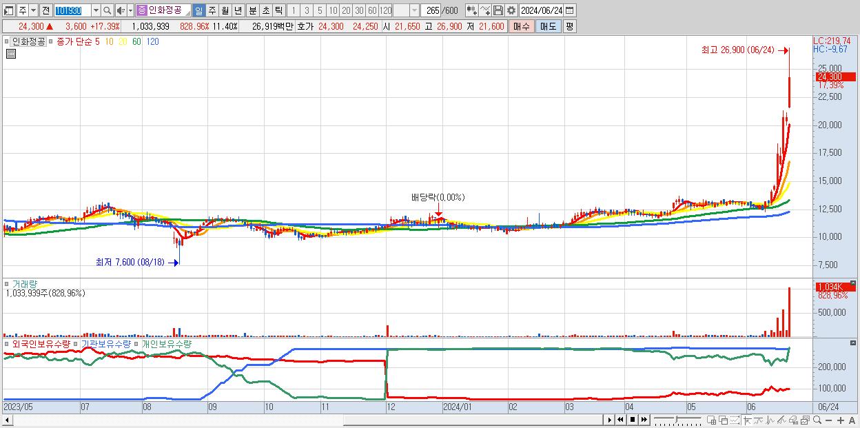 - 인화정공 (24,300원 ▲ 17.39% , 시총: 2,203억, 거래량: 1,033,939, 거래대금:269억)