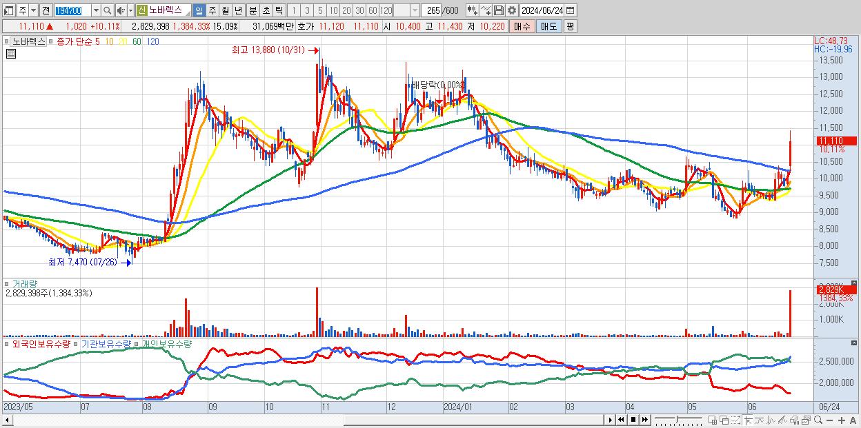 - 노바렉스 (11,110원 ▲ 10.11% , 시총: 2,084억, 거래량: 2,829,398, 거래대금:311억)