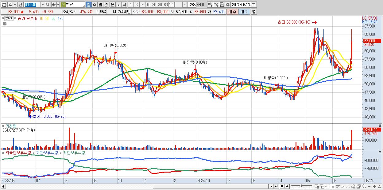 - 한샘 (63,000원 ▲ 9.38% , 시총: 14,826억, 거래량: 224,672, 거래대금:142억)