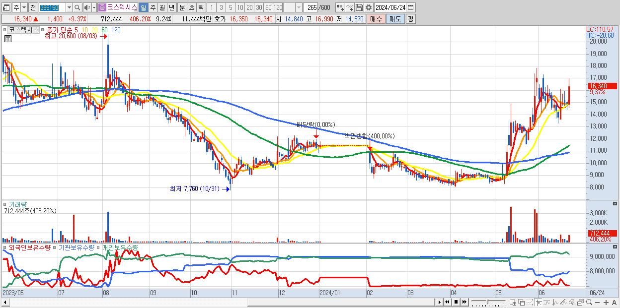 - 코스텍시스 (16,340원 ▲ 9.37% , 시총: 1,259억, 거래량: 712,444, 거래대금:114억)