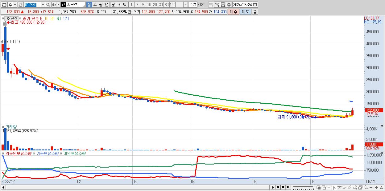 - DS단석 (122,800원 ▲ 17.51% , 시총: 7,198억, 거래량: 1,067,789, 거래대금:1,316억)