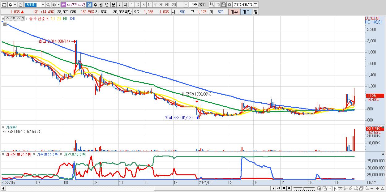- 스킨앤스킨 (1,035원 ▲ 14.49% , 시총: 367억, 거래량: 28,979,086, 거래대금:309억)