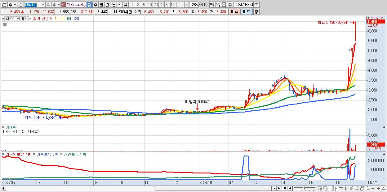 2.웨스트라이즈 6,480원 ▲ 22.03% (KOSDAQ, 064090)