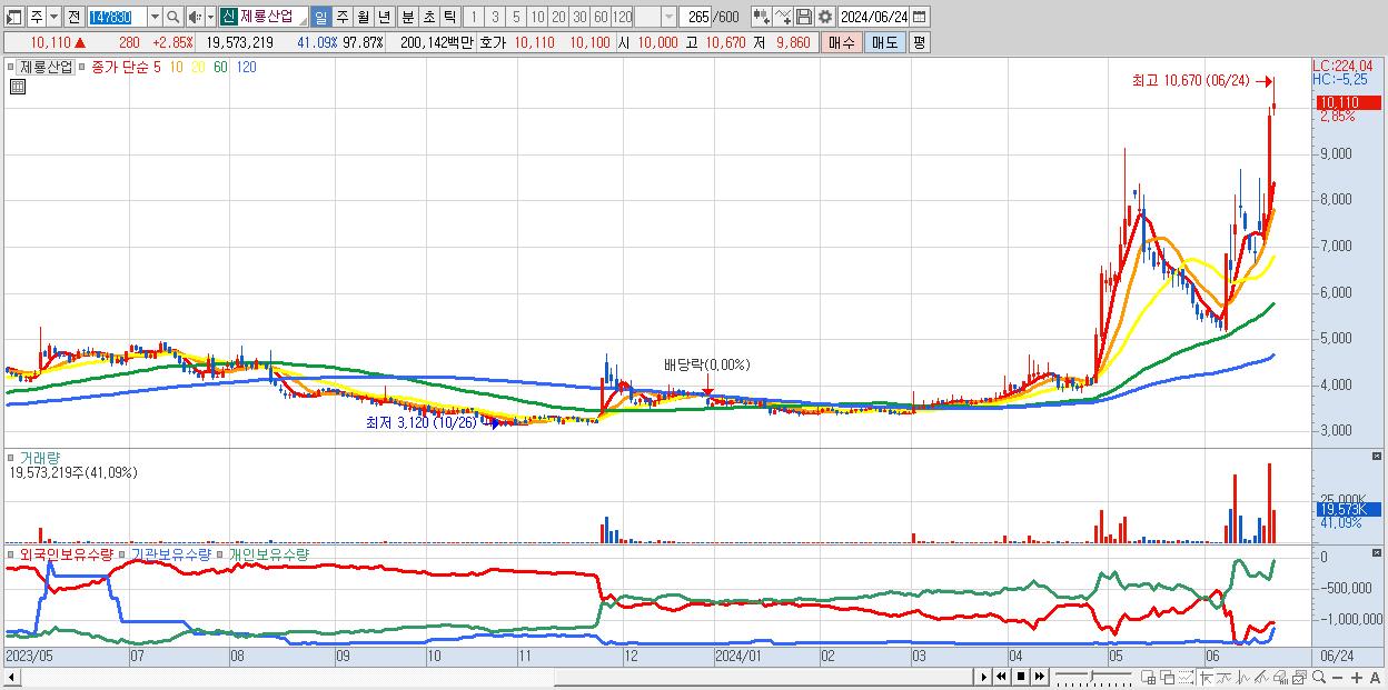 - 제룡산업 (10,110원 ▲ 2.85% , 시총: 2,022억, 거래량: 19,573,219, 거래대금:2,001억, KOSDAQ)