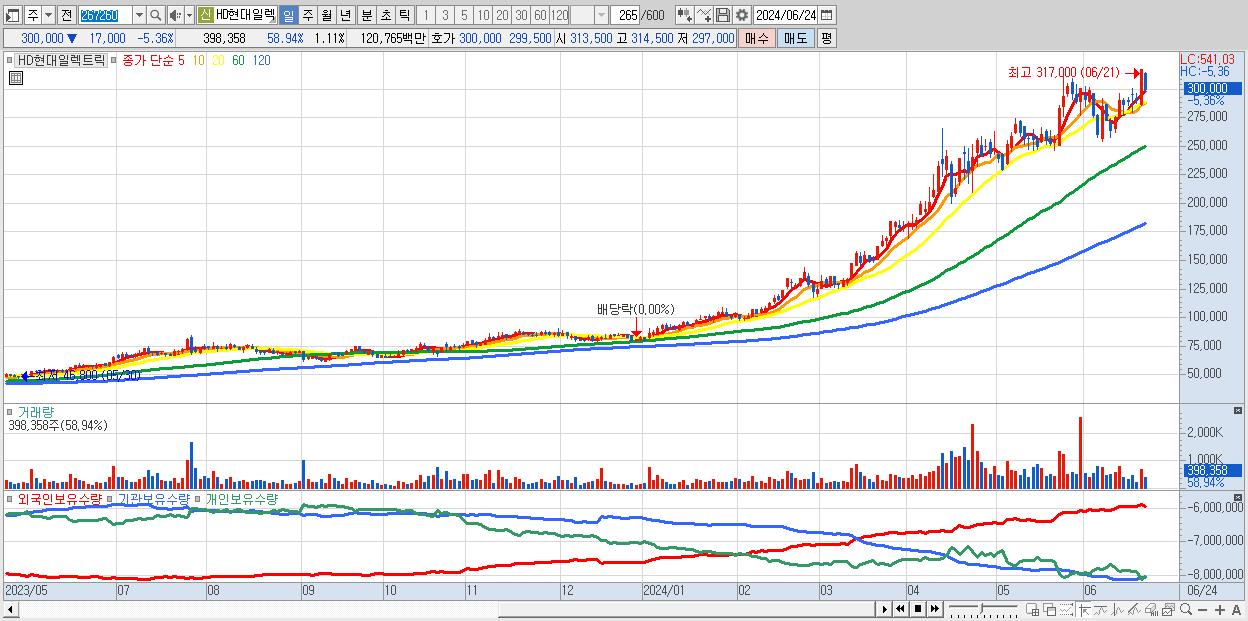 - HD현대일렉트릭 (300,000원 ▼ -5.36% , 시총: 108,141억, 거래량: 398,358, 거래대금:1,208억)