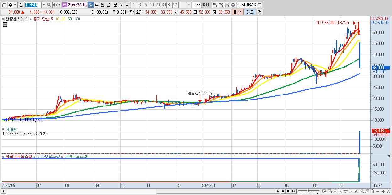 - 한중엔시에스 (34,000원 ▲ 13.33% , 시총: 2,975억, 거래량: 16,092,923, 거래대금:7,199억)