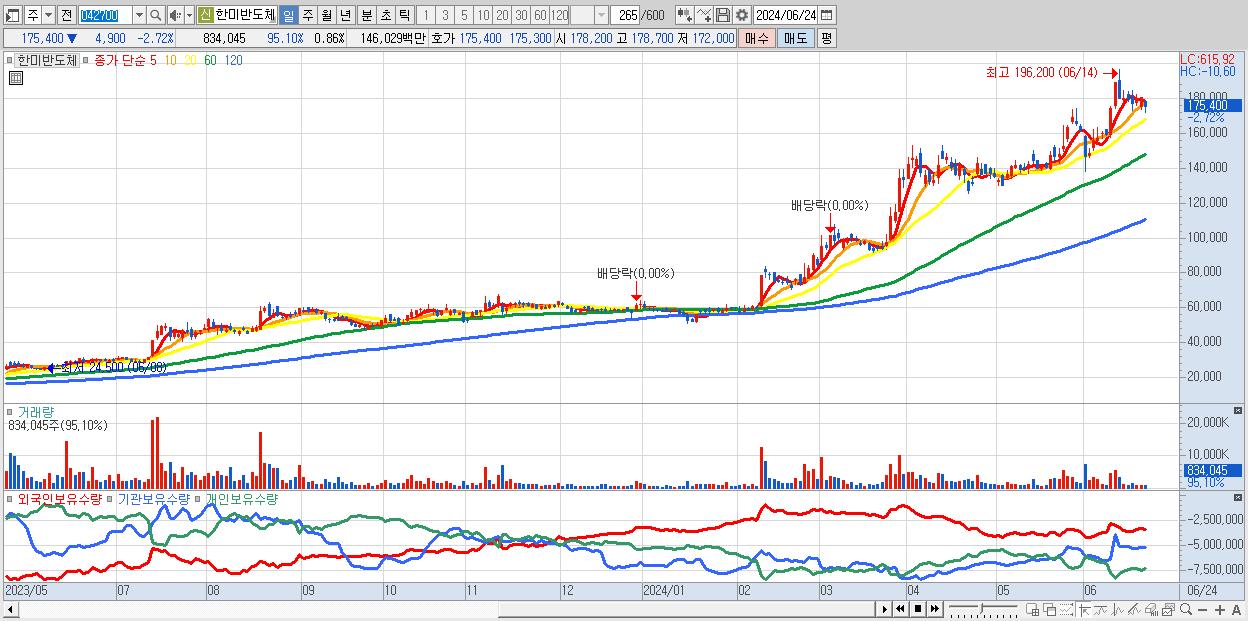 - 한미반도체 (175,400원 ▼ -2.72% , 시총: 170,127억, 거래량: 834,045, 거래대금:1,460억)