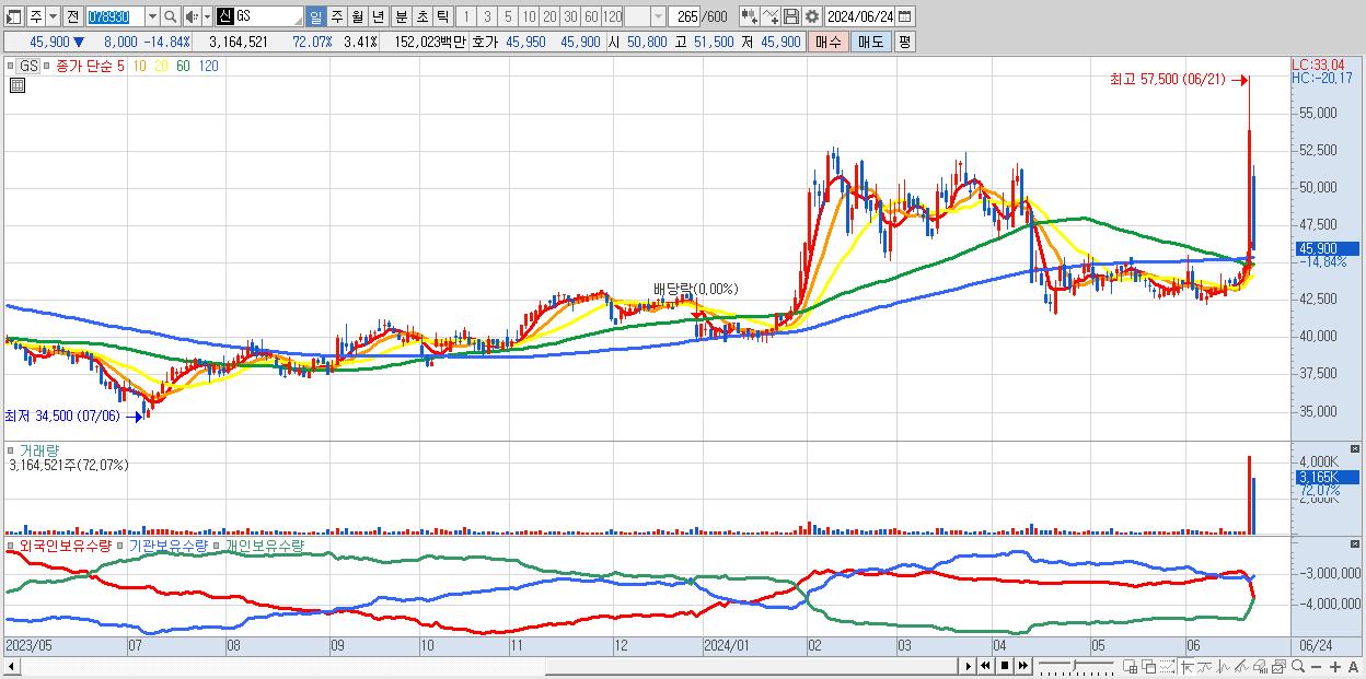 - GS (45,900원 ▼ -14.84% , 시총: 42,648억, 거래량: 3,164,521, 거래대금:1,520억)