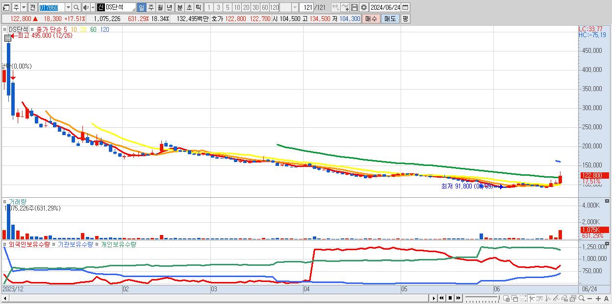 - DS단석 (122,800원 ▲ 17.51% , 시총: 7,198억, 거래량: 1,075,226, 거래대금:1,325억)
