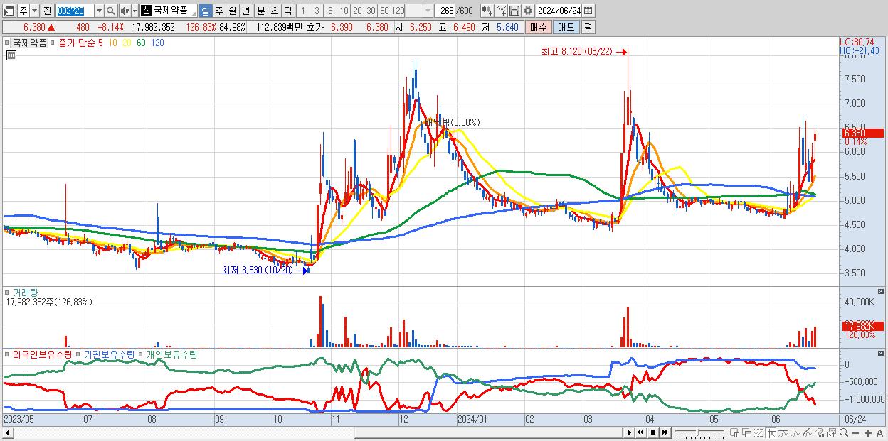 - 국제약품 (6,380원 ▲ 8.14% , 시총: 1,350억, 거래량: 17,982,352, 거래대금:1,128억)